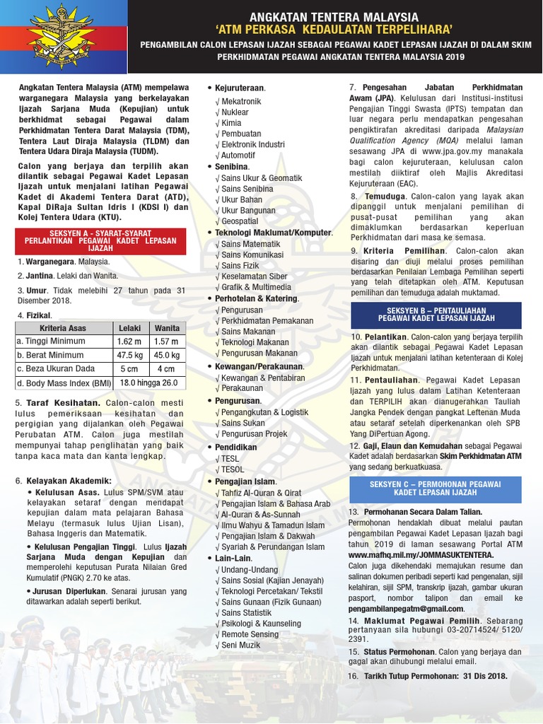 Markas Angkatan Tentera Malaysia Atm Mempelawa Lepasan Graduan Yang Berkelulusan Ijazah Sarjana Muda Dengan Kepujian Dari Ipt Dalam Atau Luar Negara Untuk Memohon Sebagai Pegawai Kadet Graduan Tahun 2018 Siri Khas