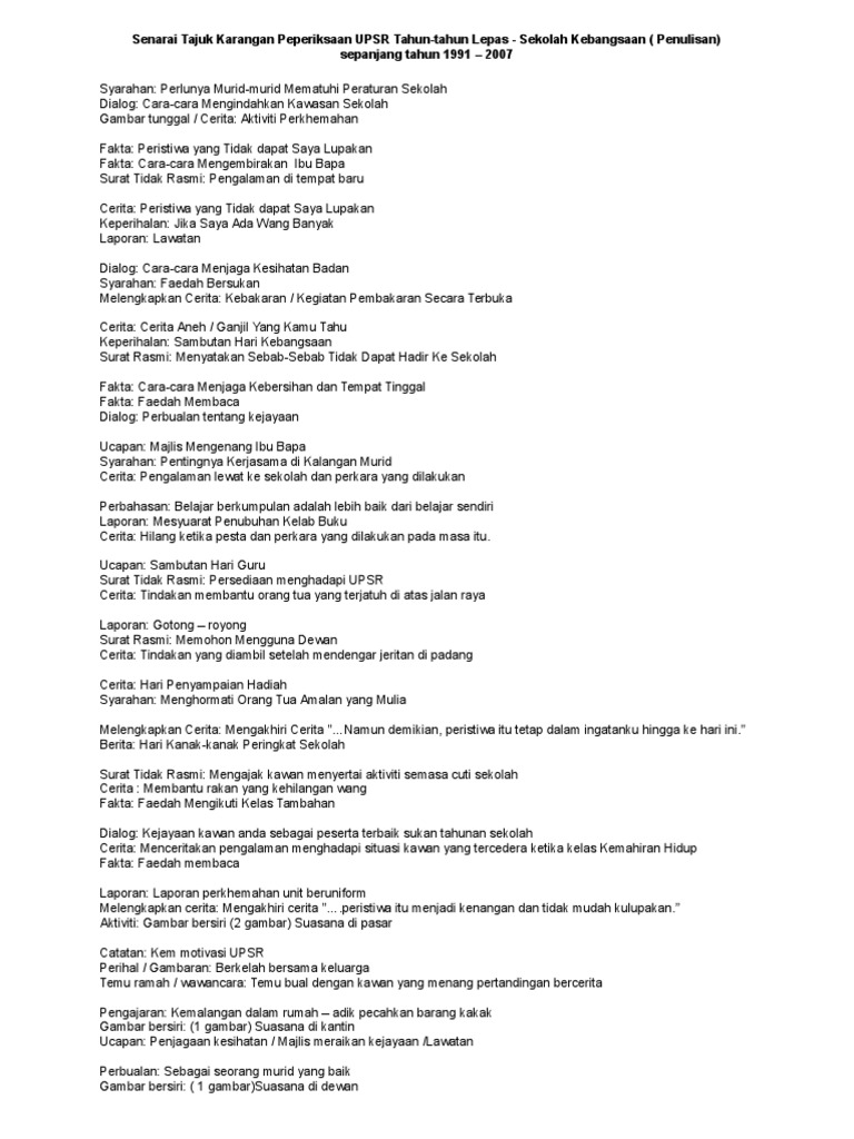 Senarai Tajuk Karangan Peperiksaan Upsr Tahun