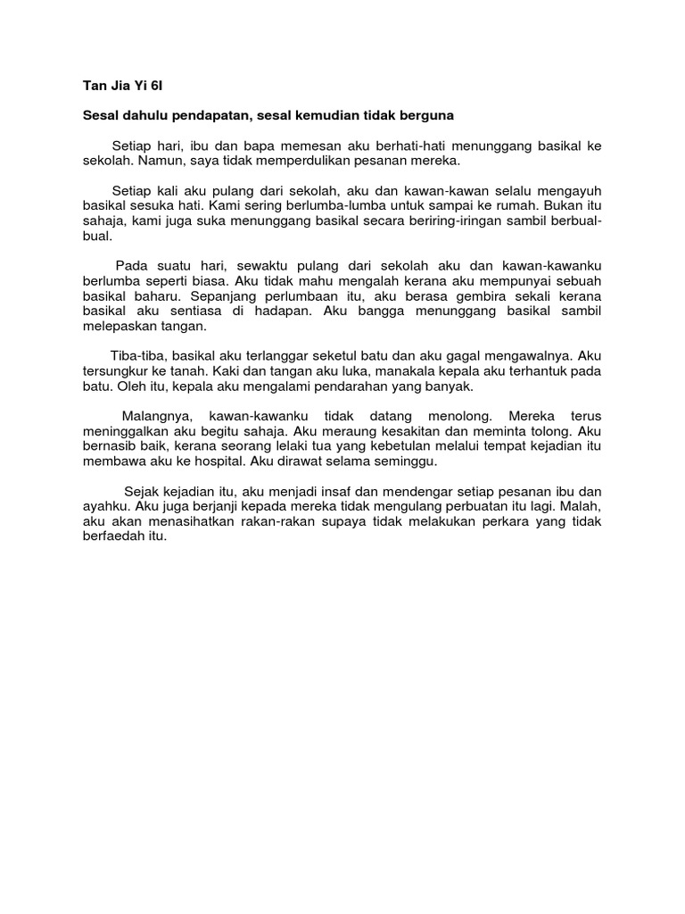 Sesal dahulu pendapatan sesal kemudian tidak berguna. Fikirkan masak masak sebelum berbuat sesuatu supaya jangan menyesal. Berkelahi dulu pendapatan berkelahi kemudian kerugian. Sesal dahulu pendapatan sesal kemudian tidak berguna pada cuti sekolah yang lalu aku telah pulang ke kampung di negeri sembilan bersama sama keluarga.