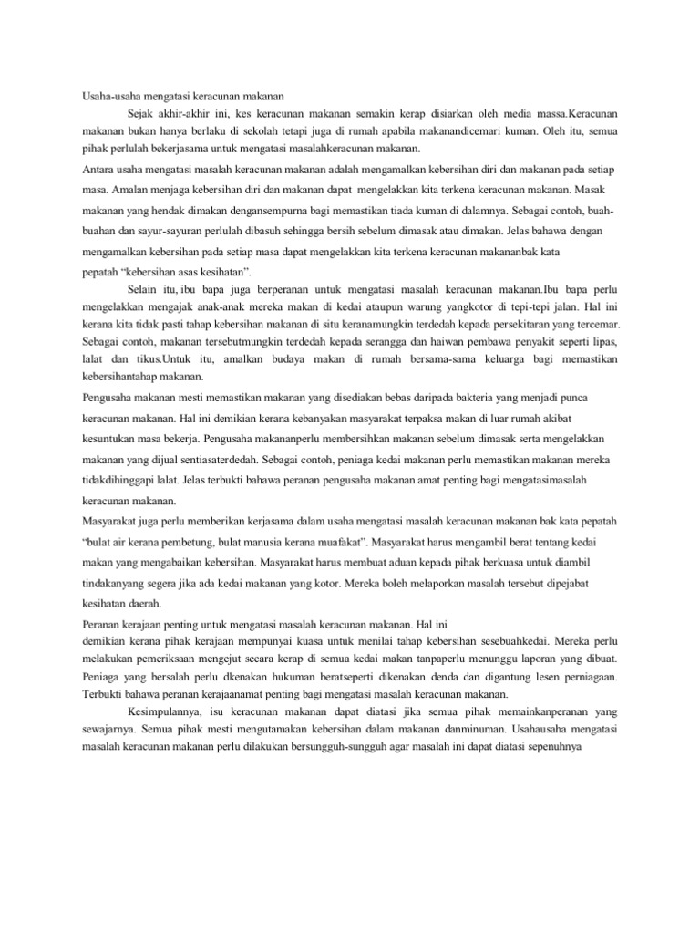 Karangan punca keracunan makanan. Terdapat beberapa punca yang boleh menyebabkan keracunan makanan antaranya. Keracunan makanan bermaksud kejadian yang melibatkan makanan yang tidak bersih lalu membawa kesakitan kepada manusia. Peribahasa melayu berkata hanya jauhari mengenal manikam yang bermaksud hanya orang yang bijaksana arif tentang sesuatu perkara. Para penyelia dan pembekal makanan mestilah mengamalkan kebersihan memastikan makanan yang disediakan dan dibekalkan bersih mesti memastikan makanan yang disediakan belum mencapai tarikh luput.