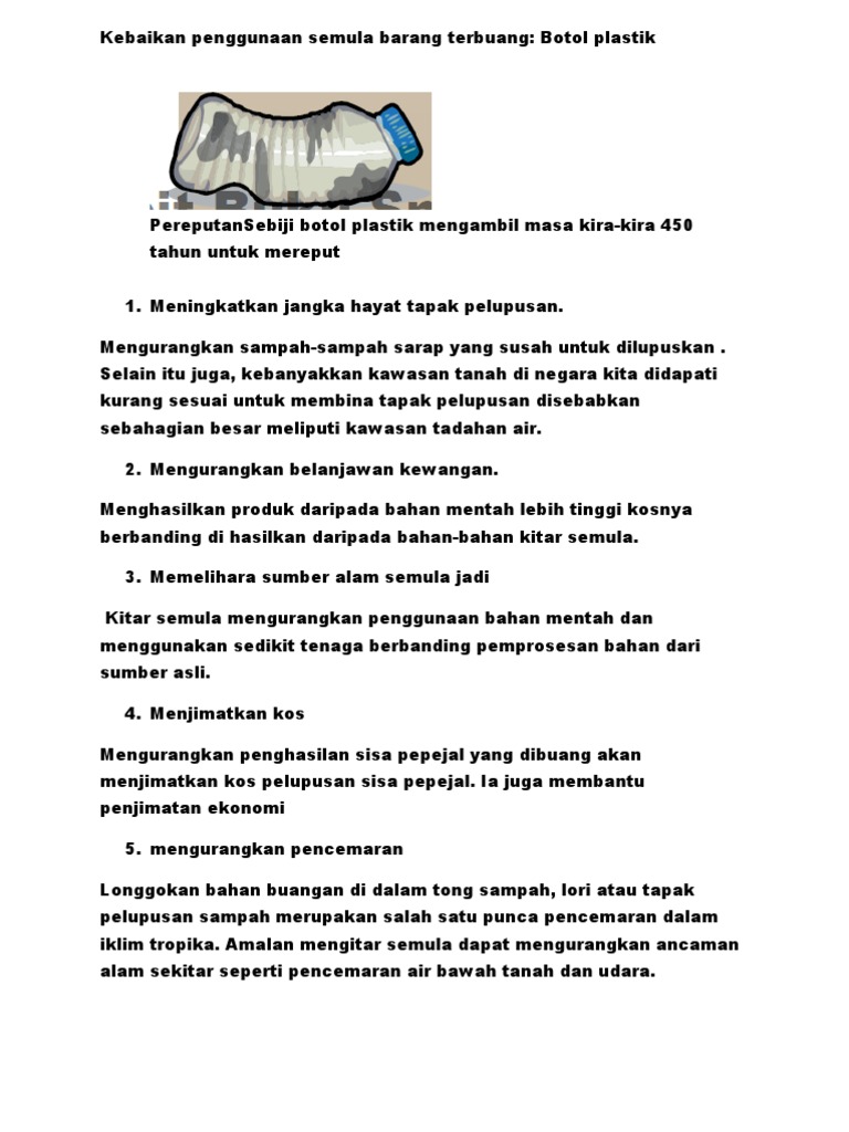 Bahan bahan buangan akan dikumpulkan di pusat pengumpulan sebelum dihantar ke kilang kilang untuk diproses semula. Habitat haiwan haiwan yang tinggal di dalam hutan juga berkemungkinan besar akan pupus. Kebaikan kitar semula pertamanya kitar semula dapat mengurangkan penggunaan bahan mentah baru. Oleh itu amalan kitar semula harus diambil peduli dalam kalangan masyarat kita posted by norshafinamuslim at 20 28.