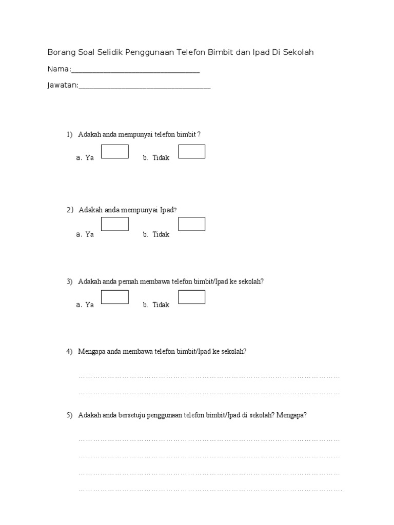Borang Soal Selidik Penggunaan Telefon Bimbit Dan Ipad Di Sekolah