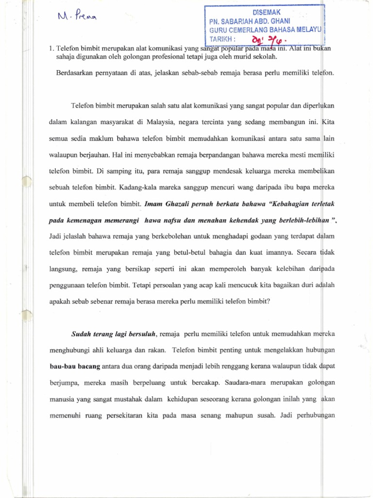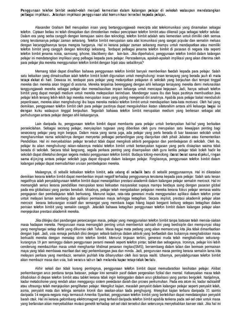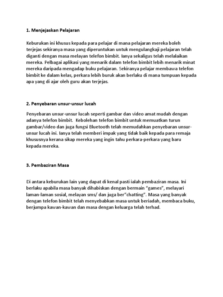 Pentadbir mesti menilai kebaikan dan keburukan membenarkan telefon bimbit di sekolah dan membuat keputusan berdasarkan populasi pelajar mereka sendiri. Isi 3 jika disingkap dari sudut yang berbeza pelajar yang menggunakan telefon bimbit dengan kerap mudah terleka dengan permainan dan hiburan yang mereka peroleh di atas talian. Hal ini dikatakan demikian kerana telefon bimbit dapat memberikan impak negatif terhadap penggunanya terutama kepada para pelajar.