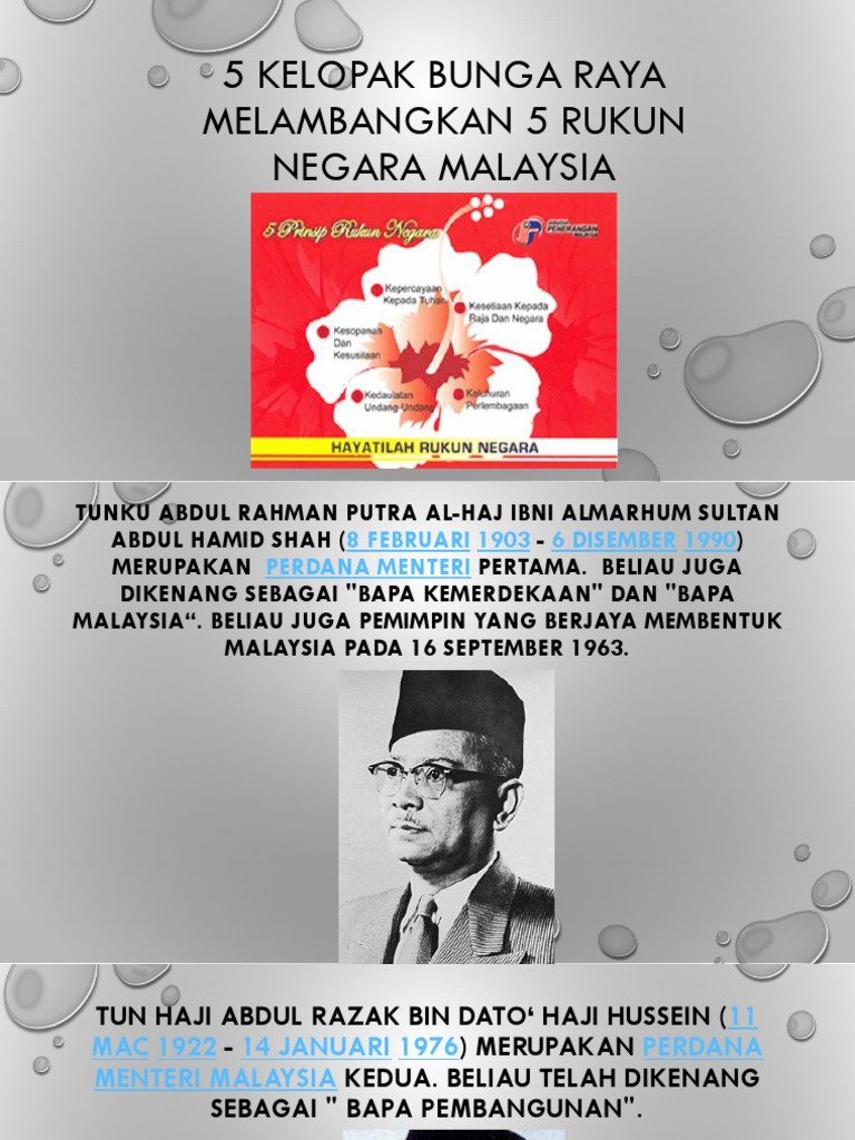 Kelopak bunga raya rukun negara. Bunga yang juga dikenali sebagai queen tropical flowers ini adalah bunga yang tergolong daripada keluarga malvaceae yang mempunyai 300 spesis tumbuhan. Bunga raya merupakan bunga kebangsaan negara kita tercinta. Selain itu sifatnya yang memiliki lima kelopak dikaitkan dengan lima prinsip rukun negara yang diperkenalkan pada tahun 1970. Kepelbagaian bunga raya dari segi warna bentuk dan ukuran menjadi lambang pelbagai bangsa agama dan kebudayaan yang hidup harmoni di negaraku malaysia tercinta.