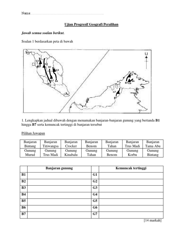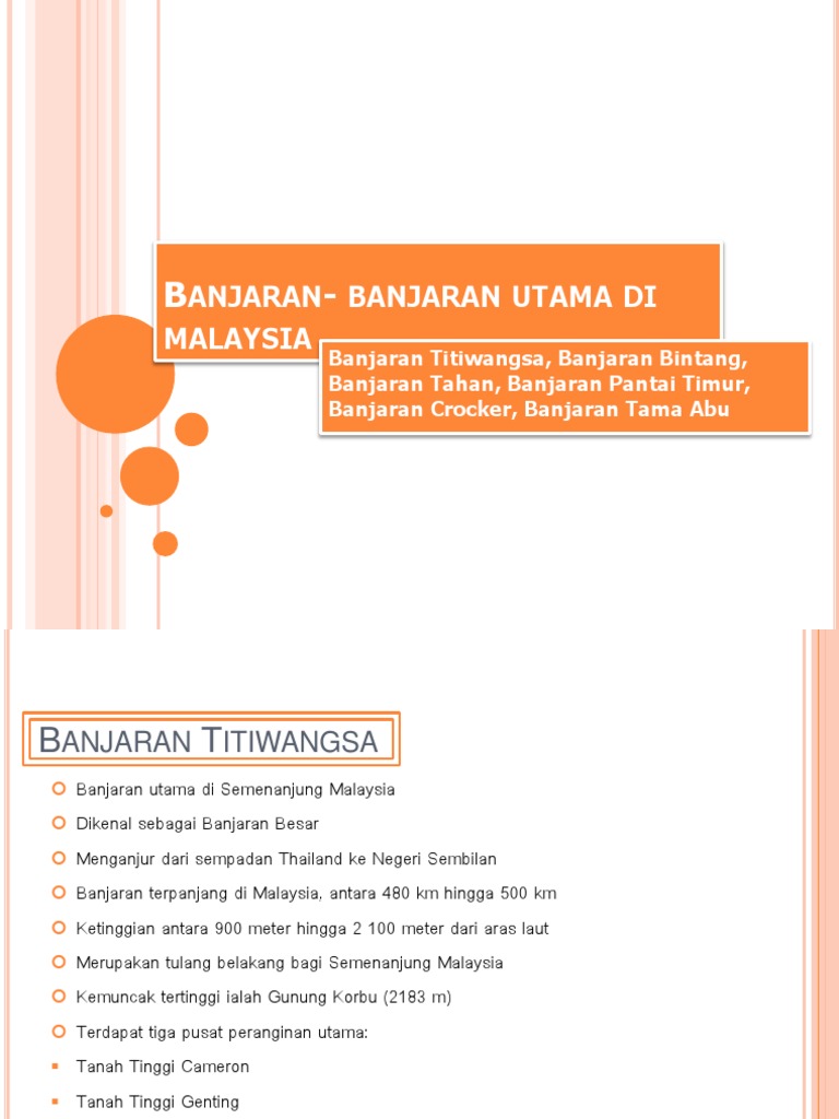 Kemuncak tertinggi di banjaran titiwangsa. Kemuncak yang tertinggi di banjaran ini ialah gunung bintang 1862 m. Gunung stong di kelantan 3 hari di tempat yang sunyi dan jauh dari kesibukan kota. Seolah olah ada sesuatu benteng yang menahannya dari menembusi ke dalam banjaran. Pola saliran atau cara cawangan cawangan sungai dicantumkan dengan sungai utama ialah pola saliran reranting.