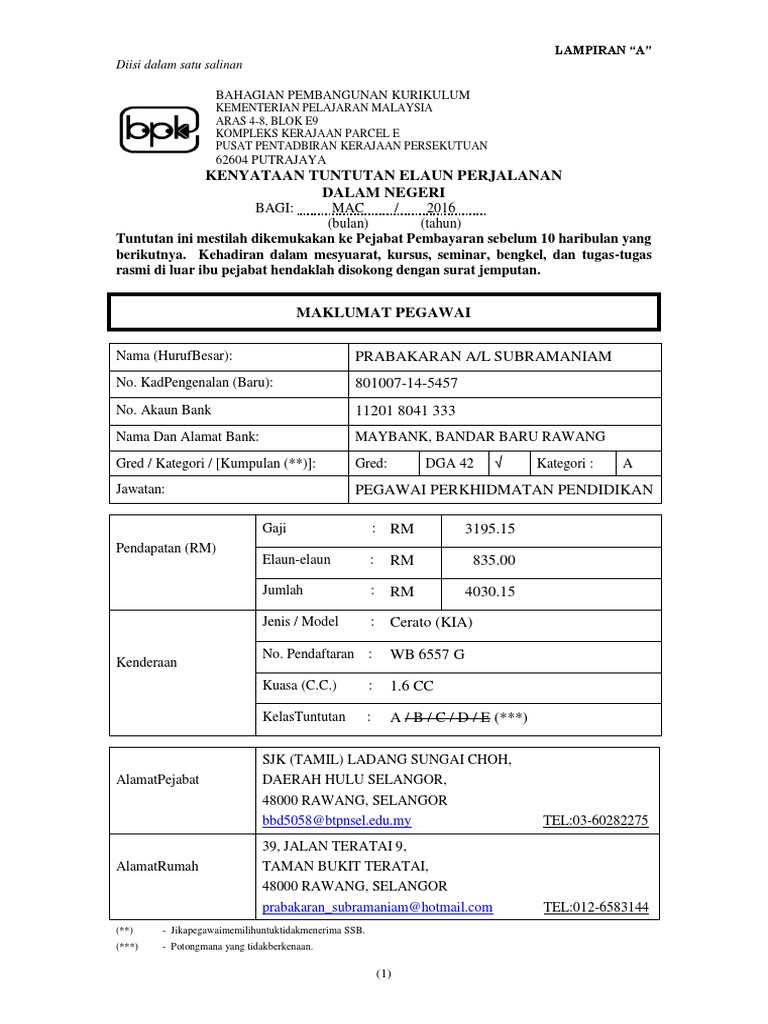 Kad pengenalan l. Kenyataan tuntutan tarikh waktu butiran tuntutan jarak bertolak sampai km. Semenanjung malaysia rgred rm rutama khas a dan ke atas 80 00 rutama khas b dan c 75 00 r53 dan 54 70 00 r45 hingga 52 60 00 r41 hingga 44 55 00 r27 hingga 40 45 00 r17 hingga 26 40 00 r16 dan ke bawah. 1 hanya satu tuntutan elaun perjalanan sahaja boleh dibuat bagi satu satu bulan.