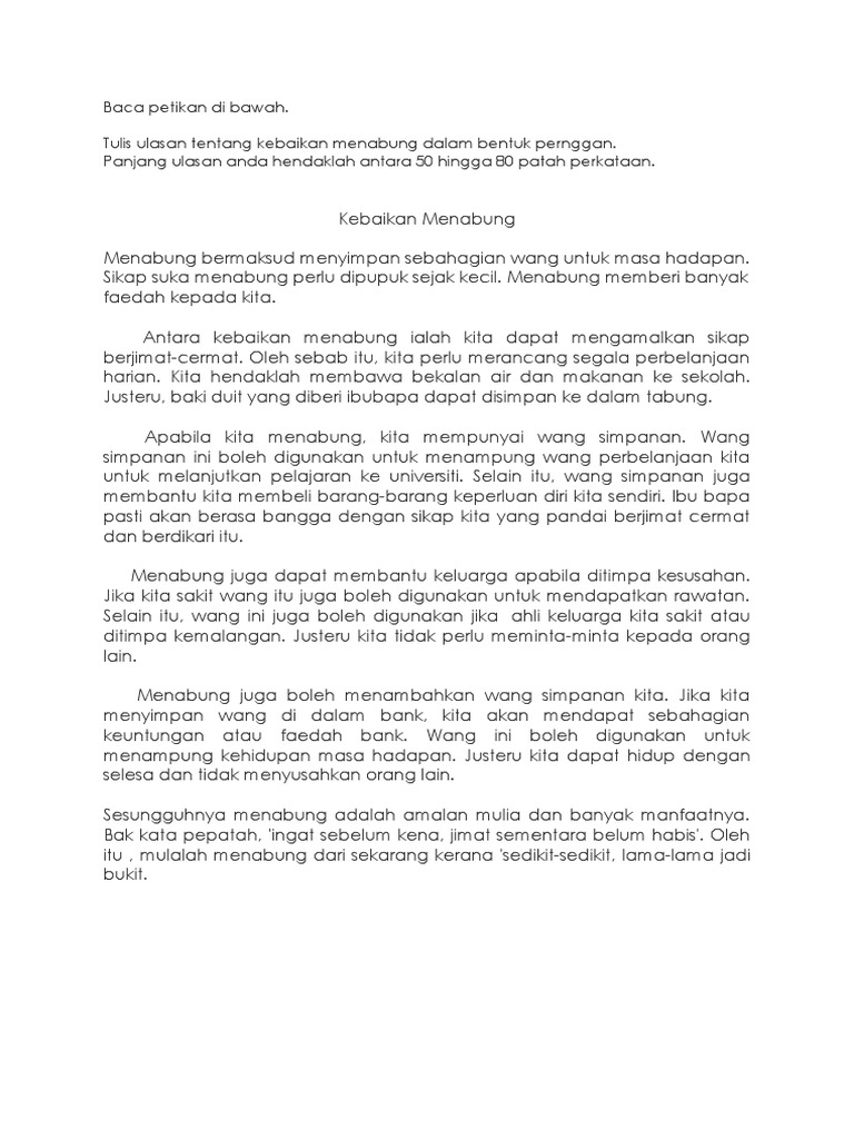 Baca Petikan Di Bawah Tulis Ulasan Tentang Kebaikan Menabung Dalam Bentuk Pernggan Panjang Ulasan Anda Hendaklah Antara 50 Hingga 80 Patah Perkataan