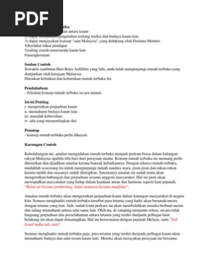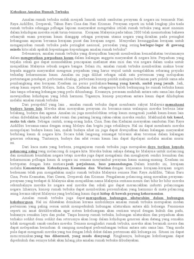 Perayaan seperti ini tidak lengkap jika tiada rumah terbuka sehingga pelbagai lapisan. Keseronokan dan kebaikan yang diperoleh semua golongan menjadikan amalan rumah terbuka tidak pernah lapuk dek hujan tidak lekang dek panas. Amalan rumah terbuka sudah menjadi lumrah dalam kalangan masyarakat malaysia. Isi 1 sebenarnya amalan rumah terbuka yang diwujudkan banyak memberikan kepentingan terutamanya dalam mengeratkan perpaduan kaum dalam kalangan anggota masyarakat di negara kita.