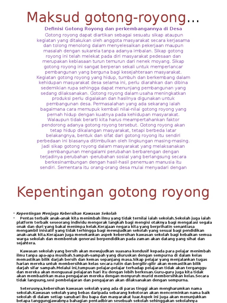 Kepentingan gotong royong di sekolah. Mengikut kamus dewan gotong royong bermaksud tolong menolong atau kerja bersama sama. Amalan ini merupakan budaya yang dipraktikkan sejak generasi dulu dan amalan ini dianggap tak basah dek hujan tak lekang dek panas. Mengikut kamus dewan gotong royong bermaksud tolong menolong atau kerja bersama sama. Bekerja bersama sama tolong menolong bantu membantu diantara anggota anggota suatu komunitas.
