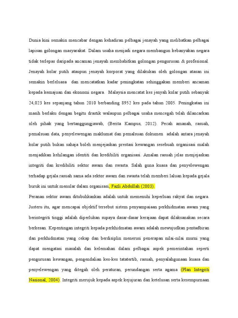 Sumbangan dan peranan setiap anggota perkhidmatan awam amat penting bagi melestarikan budaya berintegriti. Berdasarkan situasi ini maka semakin menebal tuntutan terhadap kewujudan perkhidmatan awam yang cekap dan berkesan serta mempunyai nilai kebolehpercayaan yang tinggi. Etika integriti dlmperkhidmatan awam hari profesionalisme bil 1 2009 10 jan 2009. Dan perkhidmatan awam yang cekap berdisiplin serta mempunyai integriti yang paling tinggi dengan mempertingkatkan amalan nilai nilai murni di samping berusaha mengatasi masalah masalah dan kelemahan terutamanya dalam pengurusan kewangan kerajaan pentadbiran awam pengendalian kes kes tatatertib rasuah.