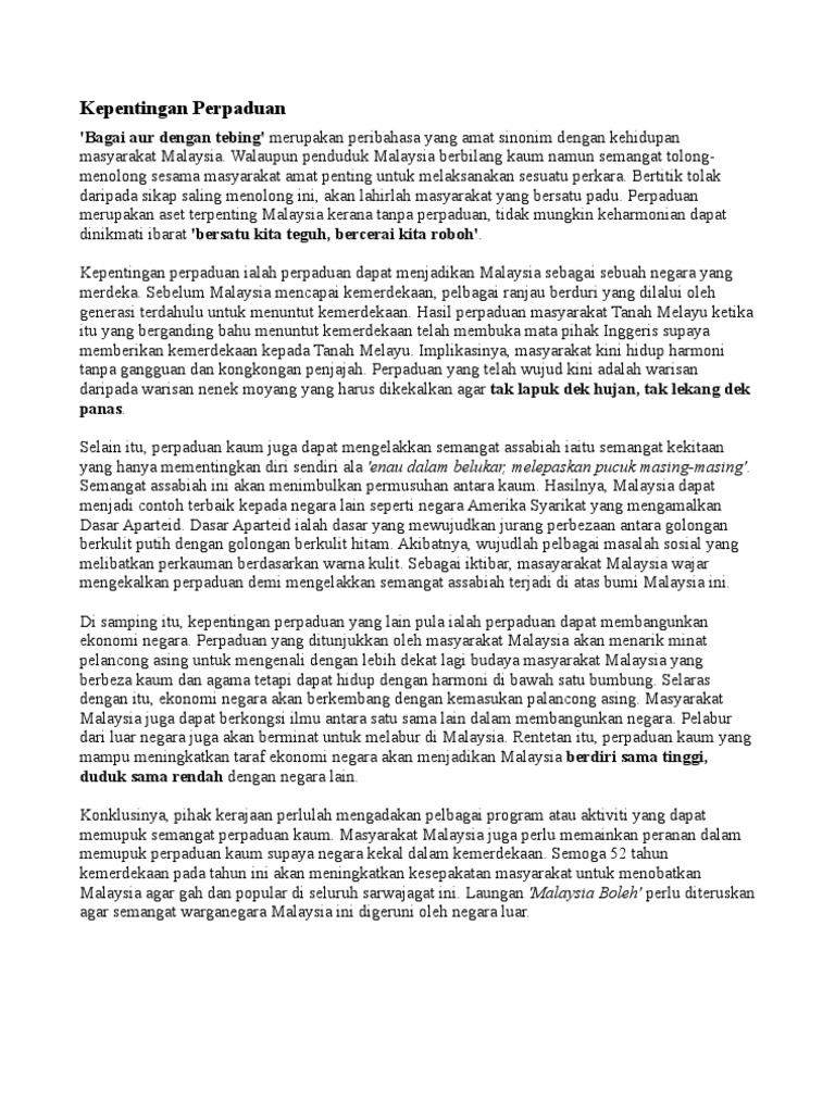 Tajuk karangan perpaduan kaum. Kepentingan mengamalkan perpaduan kaum dalam kalangan masyarakat january 30 2017 malaysia merupakan sebuah negara yang unik kerana terdiri daripada masyarakat berbilang kaum. Kepentingan perpaduan ialah perpaduan dapat menjadikan malaysia sebagai sebuah negara yang merdeka. Sebelum malaysia mencapai kemerdekaan pelbagai ranjau berduri yang dilalui oleh generasi terdahulu untuk menuntut kemerdekaan.