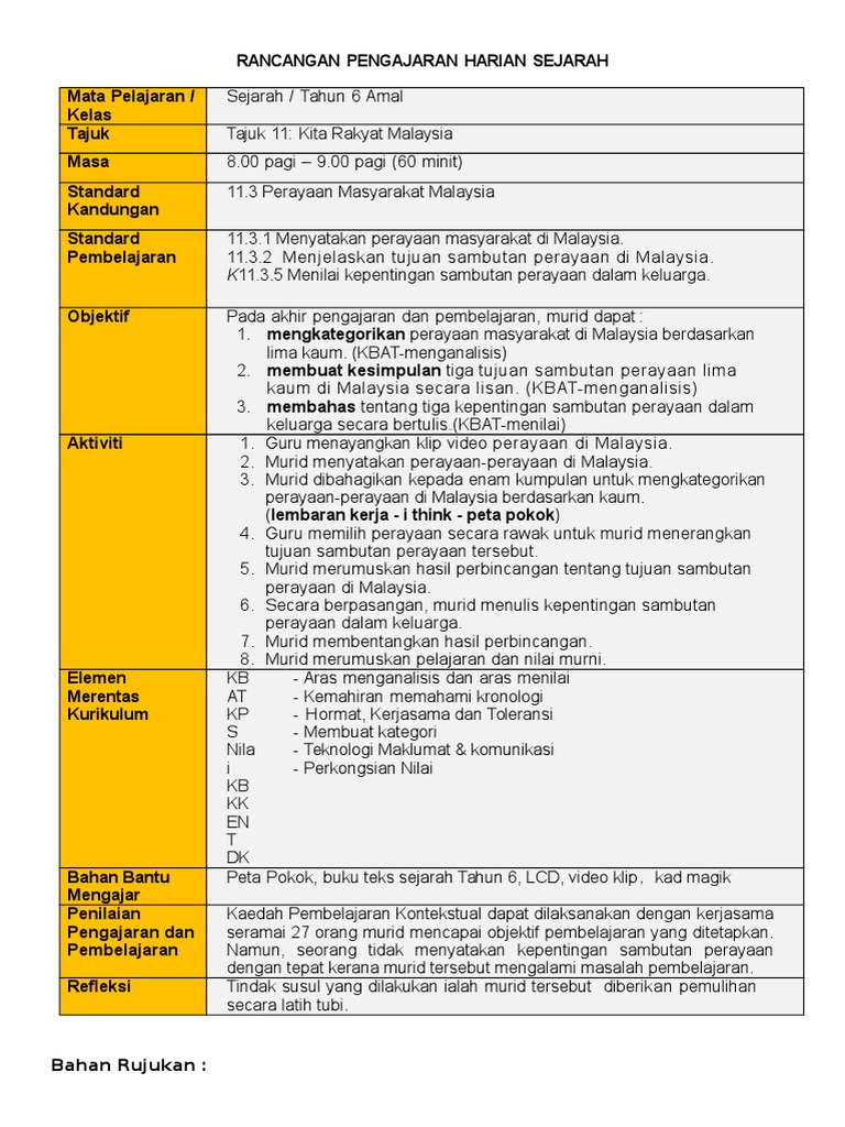 Rancangan Pengajaran Harian Sejarah Tahun 6