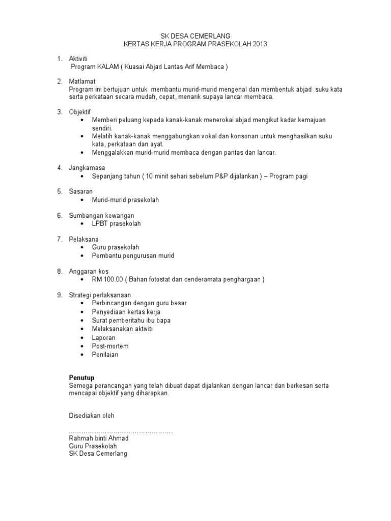 Contoh Tugasan Kertas Kerja Penubuhan Prasekolah