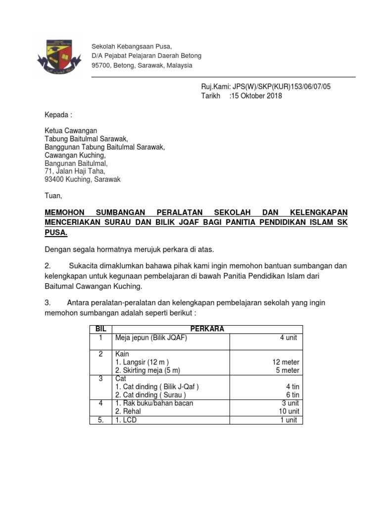 Memohon Sumbangan Peralatan Sekolah Dan Kelengkapan Menceriakan Surau Dan Bilik Jqaf Bagi Panitia Pendidikan Islam Sk Pusa