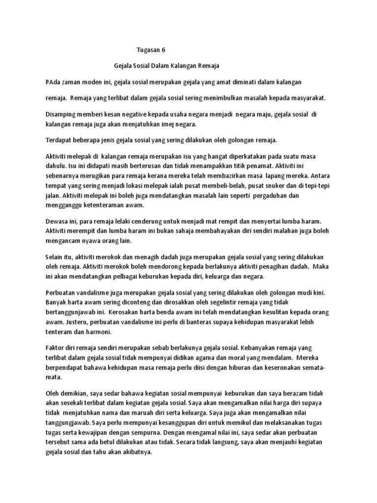 Kesan kesan masalah gejala sosial masalah gejala sosial di dalam kalangan remaja pada hari ini akan memberikan kesan dan impak yang begitu besar dalam diri individu masyarakat dan negara. Sekaligus kadar jenayah dalam kalangan masyarakat juga akan meningkat yang mana hal ini disebabkan oleh kadar keruntuhan akhlak di kalangan remaja semakin meningkat. Remaja pada hari ini merupakan aset utama dan sangat penting dalam pembangunan negara pada masa akan datang. Kesan jangka panjang dan jangka pendek pasti akan berlaku seandainya remaja dan masyarakat pada.
