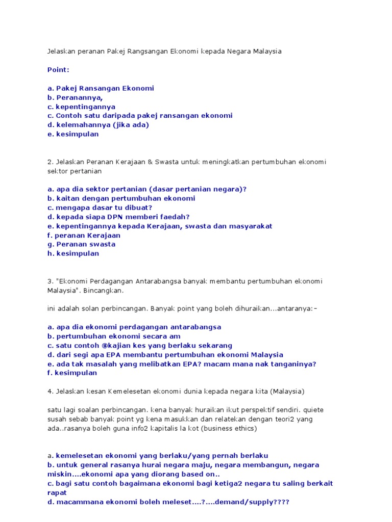 Ekonomi malaysia dijangka berkembang lebih perlahan iaitu antara 0 4 peratus hingga 2 5 peratus tahun ini dengan potensi mengalami penguncupan pertumbuhan atau kemelesetan teknikal. Pertumbuhan ekonomi malaysia pada suku keempat hanya 0 1 berbanding 4 7 pada suku ketiga tahun 2008. Memandangkan malaysia sebagai sebuah ekonomi yang sangat terbuka kesan kemelesetan global begitu dirasai oleh sektor yang berkaitan dengan perdagangan luar. Eksport dan pengeluaran kilang merosot masing masing sebanyak 7 4 dan 11 1 bagi merangsang aktiviti ekonomi kerajaan telah mengumumkan pakej.