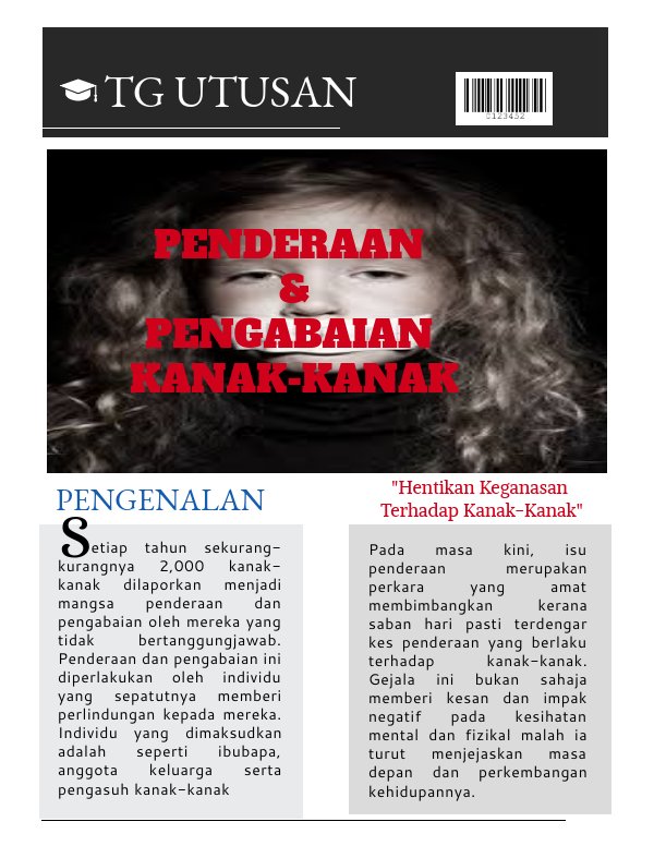 Lebih menyedihkan hampir setiap hari ia berlaku tanpa memikirkan kesan penderaan kanak kanak terhadap masa hadapan mereka. Masa depan tanpa keganasan. Memberi maklumat tentang agensi pemberi bantuan badan kerajaan dan bukan kerajaan yang ada dalam komuniti yang boleh. Nur anati binti.