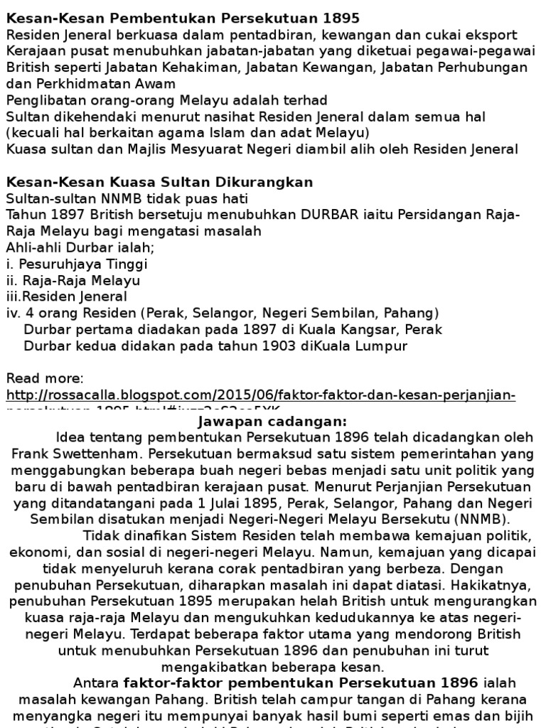 Doc Soalan Bincangkan Faktor Faktor Pembentukan Persekutuan 1896 Dan Kesan Kesannya Yaakob Smkj Academia Edu