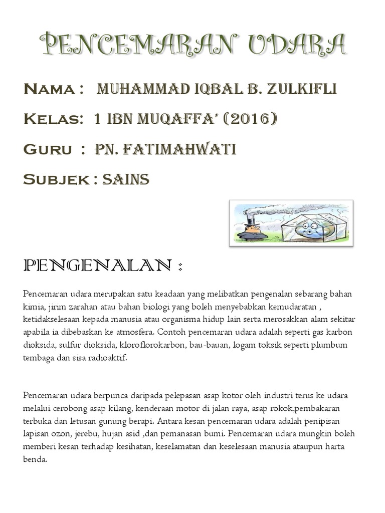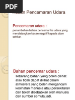 Kesan pencemaran udara kepada manusia dan alam sekitar. Bahan bahan ini kebanyakannya merupakan bahan buangan industri asap ekzos kenderaan tindakan pembalakan dan sebagainya yang mengeluarkan zarah zarah pepejal dan gas yang terlepas ke dalam udara. Keadaan ini disebabkan oleh pelbagai kelemahan dan kekangan dalam melaksanakan langkah langkah tersebut. Pencemaran alam sekitar telah memberi kesan yang buruk terhadap hidupan di dunia pada masa kini. Pembebasan gas sulfur dioksida nitrogen oksida dan karbon dioksida ke udara hasil daripada pembakaran petroleum dan arang batu di stesen jana kuasa kilang dan kenderaan yang menggunakan petrol akan terkumpul di udara kesan mengancam kesihatan manusia buah.