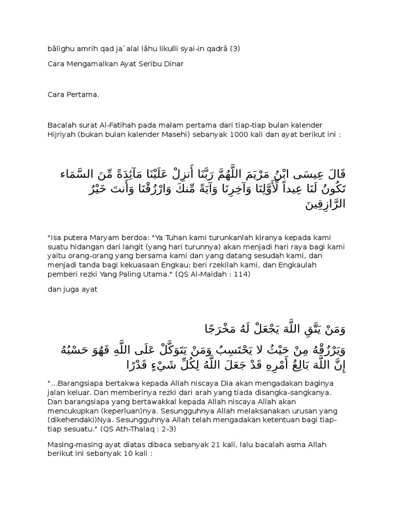 Ndalem Ksatriyan Sangu Dunia Akhirat Cara Mengamalkan Ayat Seribu 1000 Dinar