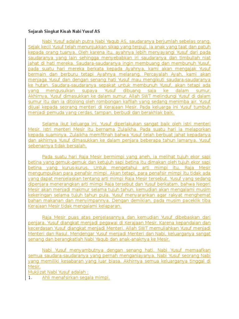 Sejarah Singkat Kisah Nabi Yusuf As