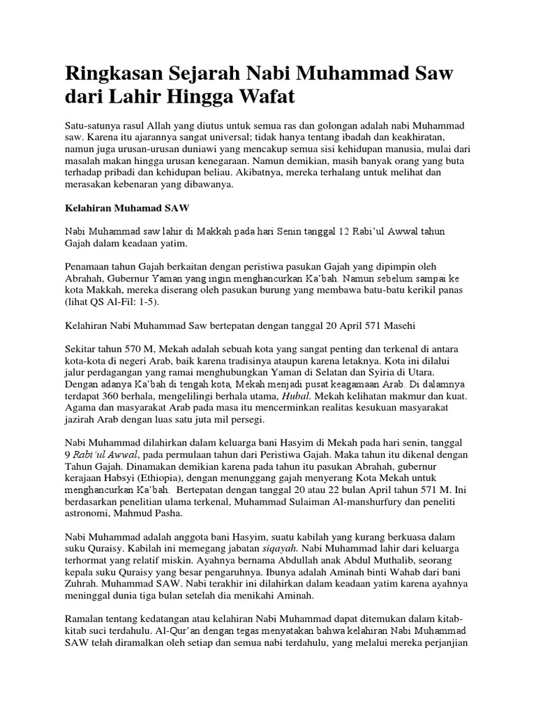 Kisah kelahiran dan masa kecil nabi muhammad saw nabi muhammad saw dilahirkan di mekkah pada tahun 570 m yaitu pada tahun yang sama ketika raja abrahah dari yaman melakukan penyerbuan ke mekkah dengan maksud untuk menghancurkan kakbah. Bani hasyim merupakan keturunan. Selain perjuangan beliau dalam menyebarkan agama islam parents juga perlu meneladani kisah hidupnya yang penuh cobaan namun tetap dijalani beliau dengan sabar. Kelahiran nabi muhammad saw rasulullah saw lahir pada tahun gajah yaitu tahun dimana pasukan gajah yang dipimpin oleh abrahah habasyah yang tengah ingin merobohkan ka bah.