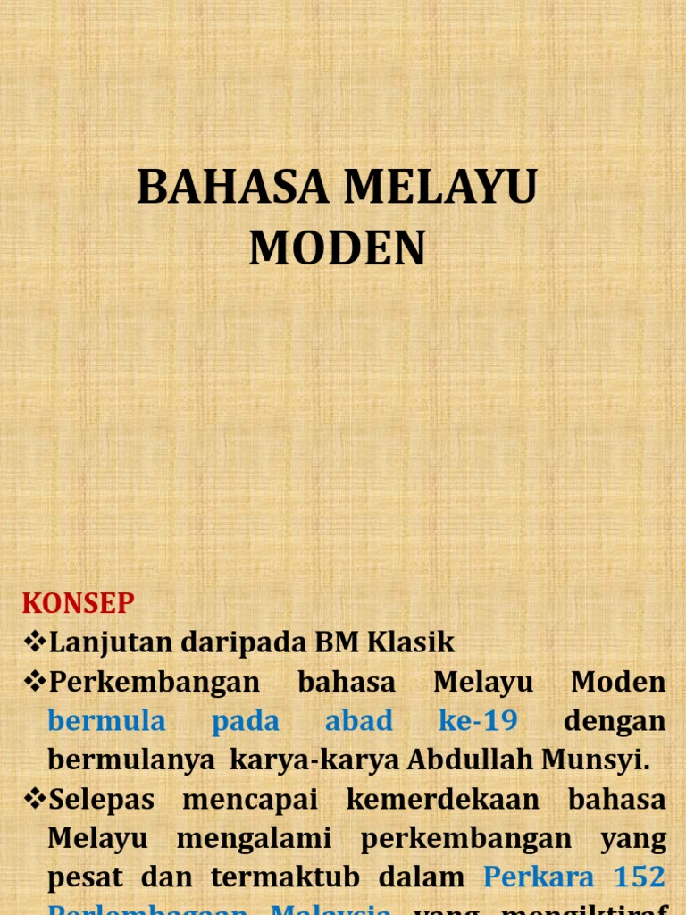 Konsep bahasa melayu moden. Bahasa melayu moden ialah bahasa melayu yang berkembang pada pertengahan abad ke 19 yang dipercayai dicetuskan oleh abdullah bin abdul kadir munsyi. Bahasa melayu moden bermula pada abad ke 19 iaitu setelah kedatangan penjajah eropah seperti portugis belanda dan inggeris. Daftar kata kamus kamus dwibahasa daftar kata pertama yang dihasilkan ialah. Bahasa melayu moden a konsep bahasa melayu moden.