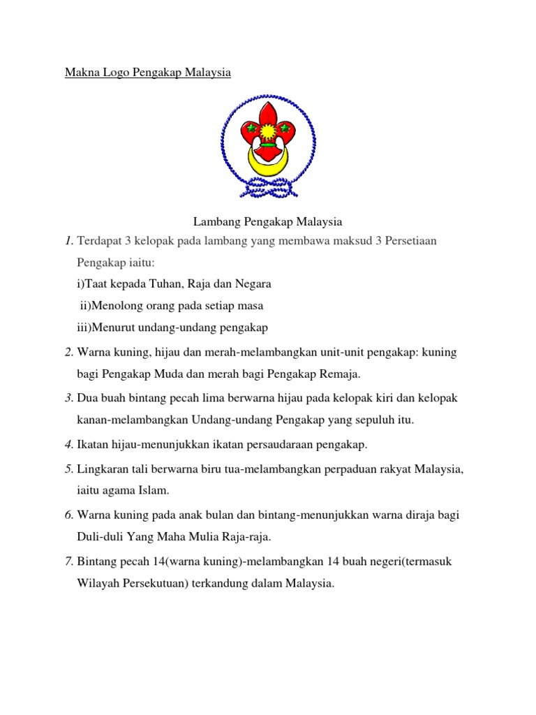 6 0 sejarah pengakap malaysia dan sejarah pengasas pengakap lord baden powell sejarah pengakap di malaysia pergerakan pengakap diperkenalkan di singapura pada 1908 dan ditubuhkan secara rasmi pada july 2 1910 apabila scout master frank cooper sands f c. A terdapat 3 kelopak pada lambang yang membawa maksud persetiaan pengakap iaitu taat kepada tuhan raja dan negara menolong orang setiap masa menurut undang undang pengakap. Lambang pengakap malaysia. Lambang pangakap malaysia dan dunia lambang pengakap malaysia a terdapat 3 kelopak pada lambang yang membawa maksud persetiaan pengakap iaitu taat kepada tuhan raja dan negara menolong 39.
