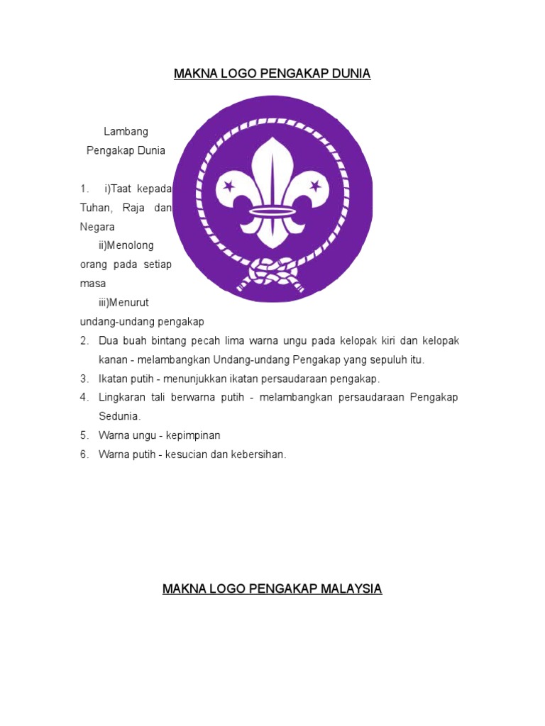 Pecahan 3 kelopak pada lambang yang membawa maksud 3 persetiaan pengakap iaitu taat kepada tuhan raja dan negara menolong orang setiap masa menurut undang undang pengakap. Makna lambang pengakap dunia pecahan tiga kelopak melambangkan persetiaan pengakap yang tiga iaitu taat kepada tuhan taat kepada raja dan taat kepada negara. Mengetahui lambang pengakap malaysia lambang pengakap sedunia 2. Dua buah bintang pecah lima warna ungu pada kelopak kiri dan kelopak kanan melambangkan undang undang pengakap.