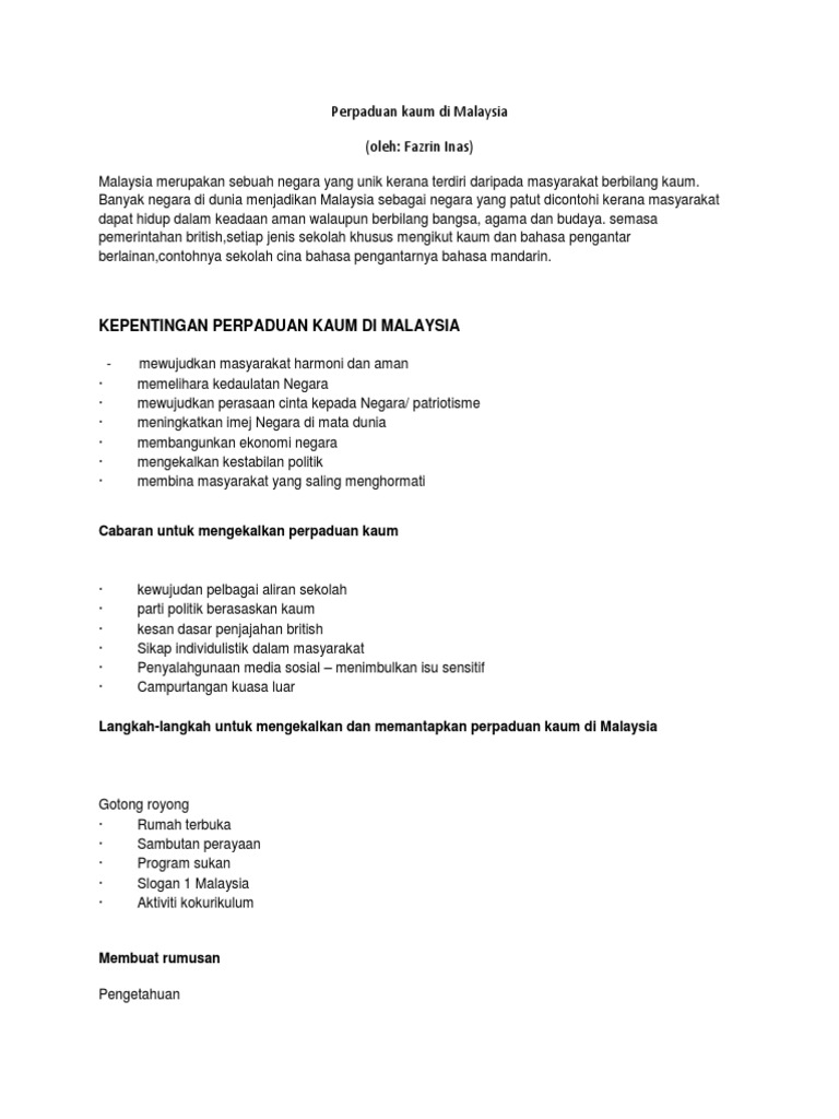 Perpaduan Kaum Di Malaysia