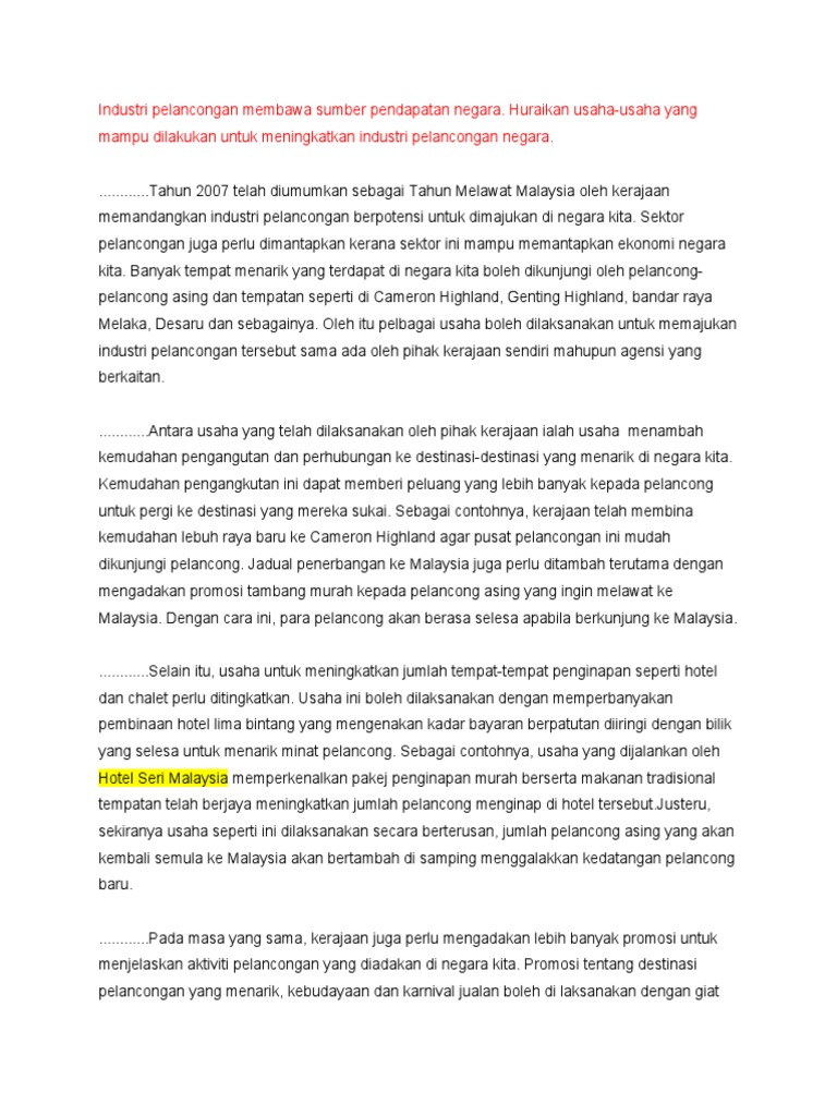 Untuk makluman semua penulisan karangan bahasa melayu mempunyai pelbagai tajuk dan tema yang berpotensi menjadi soalan pilihan karangan dalam peperiksaan. Usaha usaha memajukan industri pelancongan negara sebagai sebuah negara yang beriklim khatulistiwa malaysia mempunyai alam semula jadi yang unik dengan deretan pulau yang menawan. Pada tahun 2000 purata pelancongan yang berkunjung ke malaysia dianggarkan seramai 10 2 juta orang. Dengan ini sistem pengankutan yang sistematik akan memudahkan pelancong asing pergi dari satu destinasi ke satu destinasi yang lain.