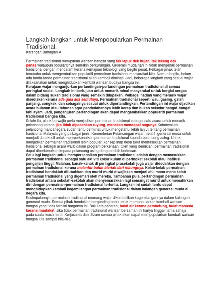 Langkah mempopularkan permainan tradisional. Karangan bahagian a permainan tradisional merupakan warisan bangsa yang tak lapuk dek hujan tak lekang dek panas walaupun popularitinya semakin berkurangan. Langkah langkah untuk mempopularkan permainan tradisional. Kempen ini perlu dijalankan oleh jabatan kebudayaan dan kesenian negara secara terancang dan berkesan dengan kerjasama pihak media cetak dan media elektronik seperti akhbar dan. Pelajar hanya perlu mencari isi isi penting yang sesuai serta mencari peribahasa atau frasa frasa menarik bagi menghasilkan penulisan karangan yang cemerlang.