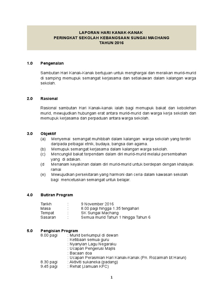Pada pukul 7 30 pagi murid murid dan guru guru sekolah terlebih dahulu berhimpun untuk membaca doa. Laporan sambutan hari kanak kanak. Sambutan hari kanak kanak merupakan sambutan yang disambut pada setiap tahun oleh banyak negara tidak terkecuali di malaysia. Jumaat laporan majlis sambutan hari kanak kanak 2016 peringkat sekolah telah dilaksanakan dengan baik dan lancar.