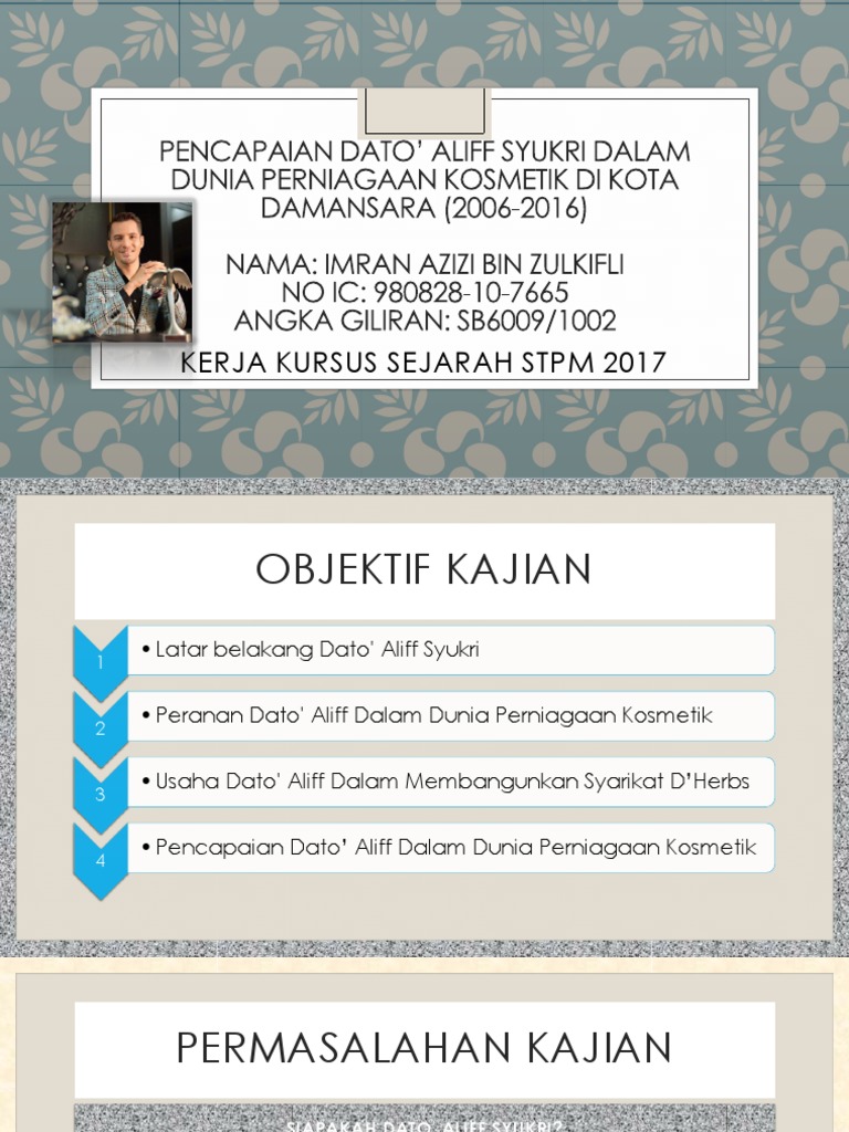 Susuk tubuh ini dilahirkan pada 3april 1987 di felda kechau kuala lipis. Dan kini kami mengorak langkah maju setapak kehadapan dengan menghasilkan hampir 30 rangkaian produk baru dengan seramai 15 orang kakitangan yang membantu melancarkan perjalanan syarikat. Dato aliff syukri kamarzaman tempat lahir. Bhd datuk seri aliff syukri kamarzaman memberi bayangan syarikat beliau bakal disenaraikan di bursa malaysia menjelang hujung tahun ini.