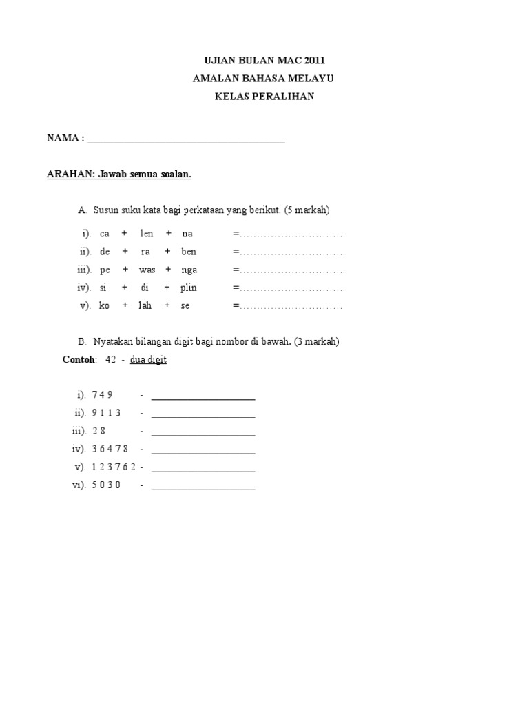 Soalan Amalan Bahasa Melayu Kelas Peralihan Kerja Kosl