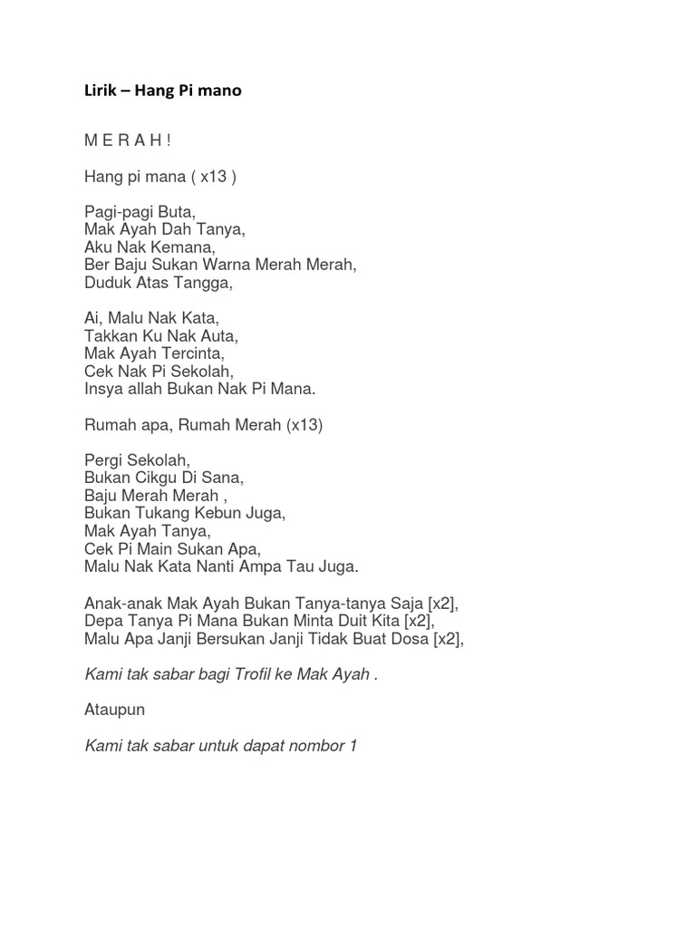 Lirik hang pi mana. Hang pi mana kerja apa hang pi mana kerja apa hang pi mana kerja apa hang pi mana. 50 videos play all mix lirik hang pi mana youtube. Upin ipin feat khalifah composer. Hang pi mana hang pi mana hang pi mana hang pi mana pagi pagi buta mak dan ayah dah tanya aku nak kemana berseluar yankee baju bunga bunga duduk atas tangga ai.