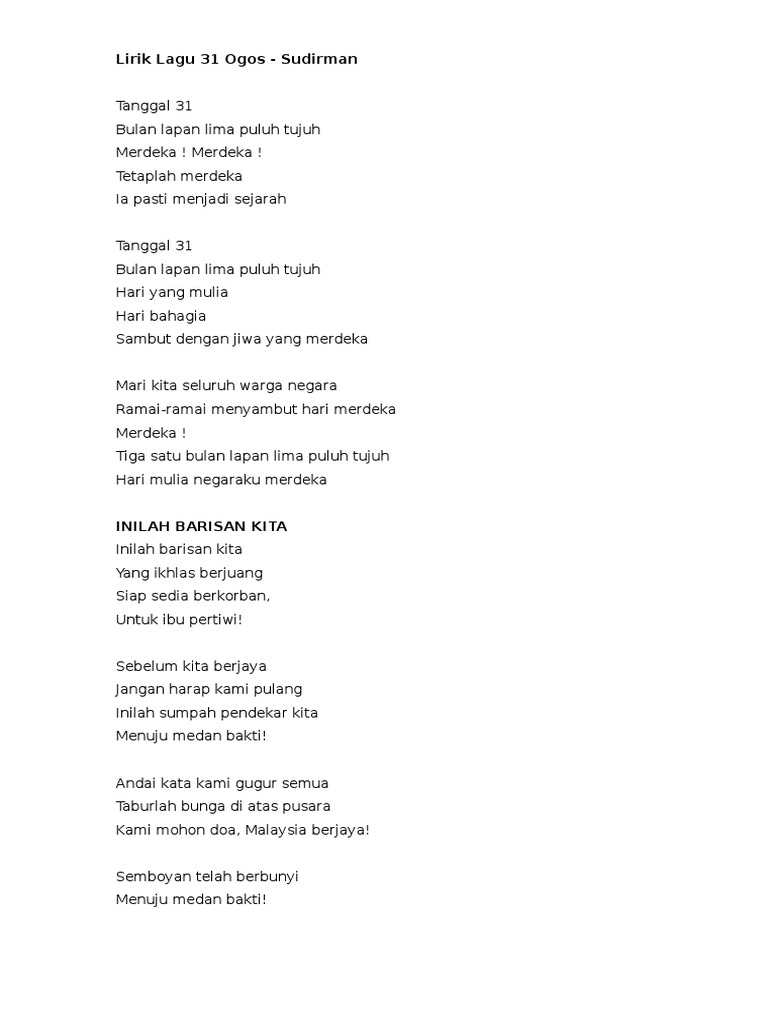 Lirik lagu 31 ogos sudirman. Tetaplah merdeka ia pasti menjadi sejarah tanggal 31 bulan lapan lima puluh tujuh hari yang mulia hari bahagia sambut dengan jiwa yang merdeka mari kita seluruh warga negara ramai ramai menyambut hari merdeka merdeka. Tetaplah merdeka ia pasti menjadi sejarah tanggal 31 bulan lapan lima puluh tujuh hari yang mulia hari bahagia sambut dengan jiwa yang merdeka. Lagu ini bertujuan untuk menyemai amalan budaya integriti dan menolak rasuah dalam kehidupan.