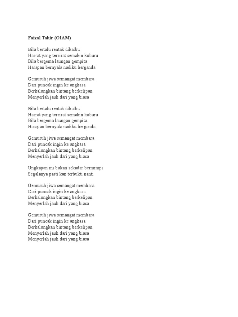 Lirik gemuruh faizal tahir. Gemuruh jiwa semangat membara dari puncak ingin ke angkasa berkalungkan bintang berkelipan menyerlah jauh dari yang biasa. Lirik lagu gemuruh faizal tahir. Gemuruh faizal tahir lirik.