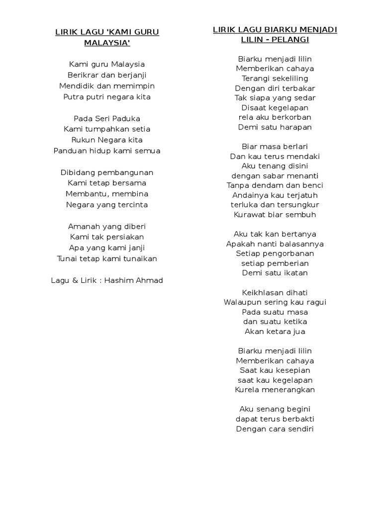Amanah yang diberi kami tak persiakan apa yang kami janji tunai tetap kami tunaikan. Lirik lagu guru malaysia dan guru pembina negara bangsa lagu guru malaysia kami guru malaysia berikrar dan berjanji mendidik dan memimpin putra putri negara kita. Lirik lagu kami guru malaysia lagu hari guru kami guru malaysia berikrar dan berjanji mendidik dan memimpin putra putri negara kita. Jom download koleksi lagu tema hari guru yang best.
