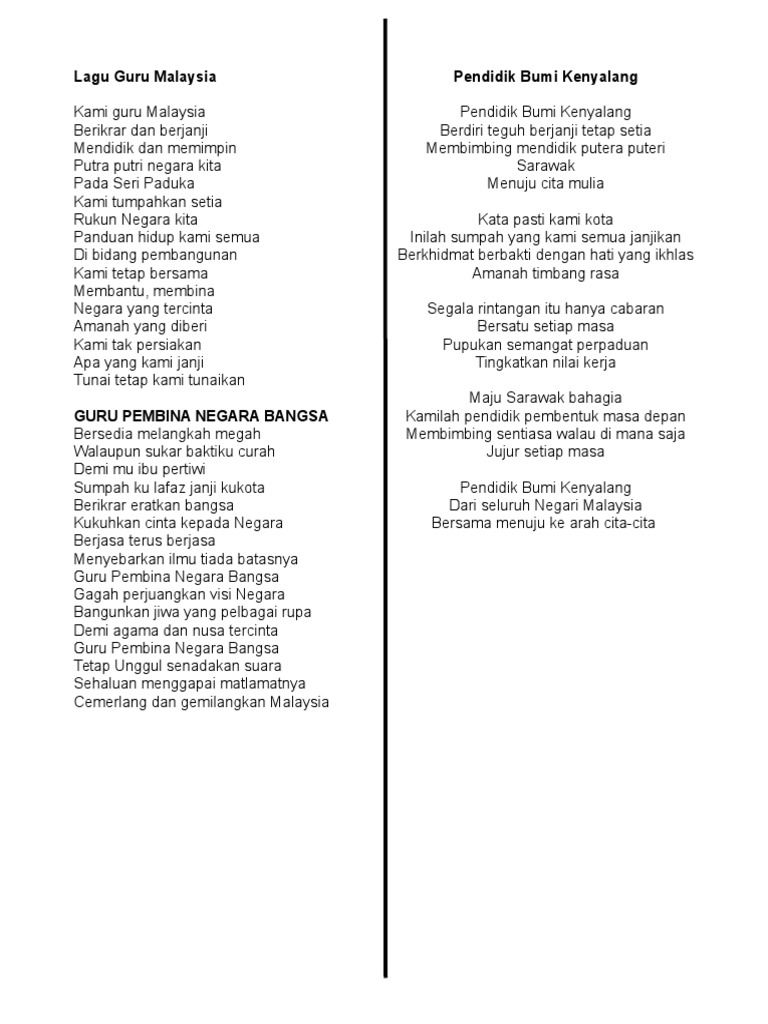 Lirik lagu guru malaysia. Pada seri paduka kami tumpahkan setia rukun negara kita panduan hidup kami semua. Kami guru malaysia berikrar dan berjanji mendidik dan memimpin putra putri negara kita pada seri paduka kami tumpahkan setia rukun negara kita panduan hidup. Pada seri paduka kami tumpahkan setia rukun negara kita panduan hidup kami semua.