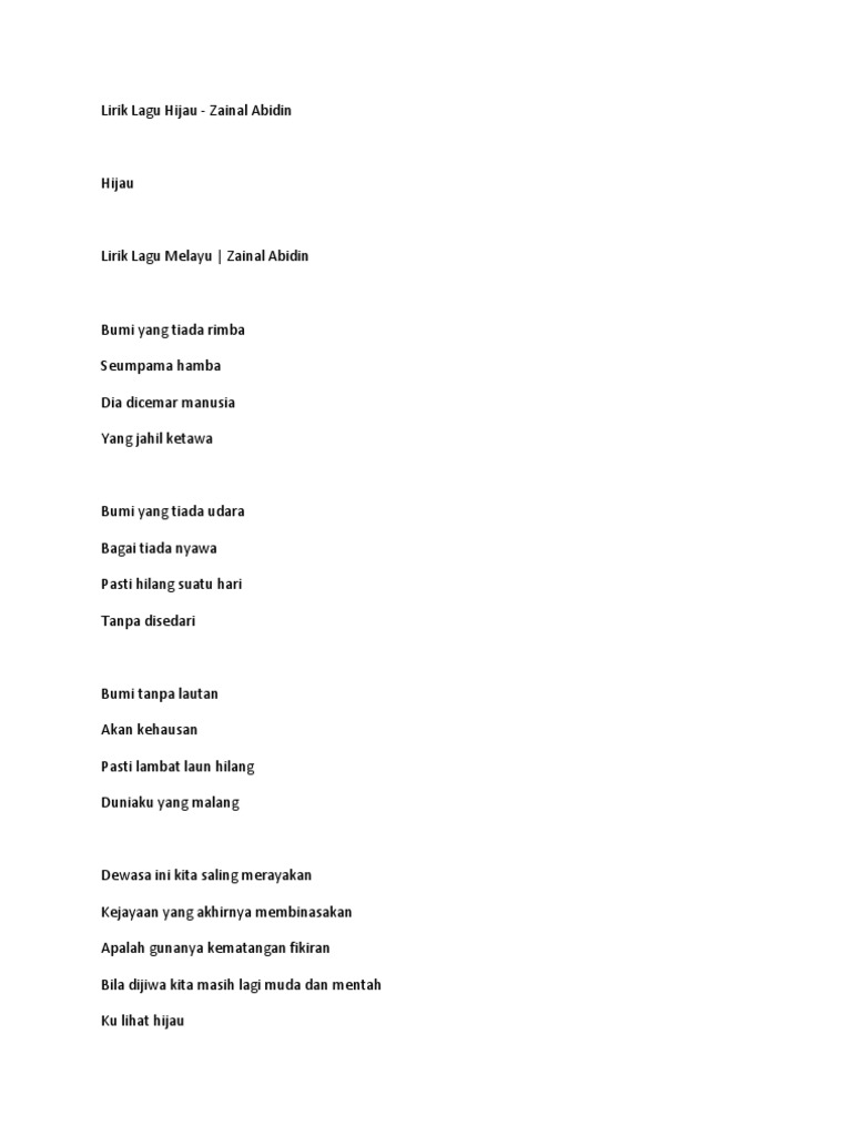 Lirik lagu hijau zainal abidin. Ku lihat hijau bumiku yang kian pudar siapa yang melihat di kala kita tersedar mungkinkah terlewat korupsi oppressi obsessi diri polussi depressi di bumi kini. Lirik lagu zainal abidin ceritera hijau ikhlas tapi jauh inayah insaf kau di hati ku manis orak arek pertemuan ini seindah mimpi satu ke halaman utama copyrigth 1999 2001 imnogman tm zzz reversed tech inc. Bumi yang tiada rimba seumpama hamba dia dicemar manusia yang jahil ketawa. Zainal abidin hijau bumi yang tiada rimba seumpama hamba dia dicemar manusia yang jahil ketawa bumi yang tiada udara bagai tiada nyawa pasti hilang suatu hari.