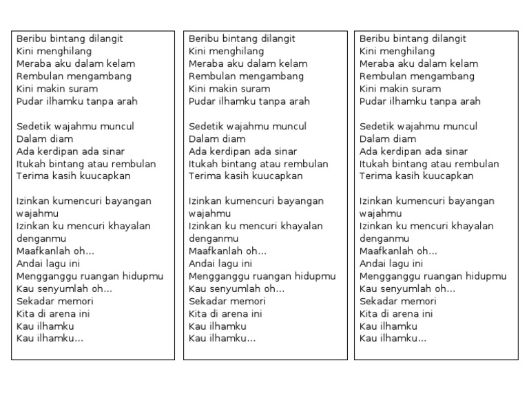 Di blog ini kami hanya memaparkan lirik lagu. Beribu bintang dilangit kini menghilang meraba aku dalam kelam rembulan mengambang kini makin suram pudar ilhamku tanpa arah sedetik wajahmu muncul dalam diam ada.