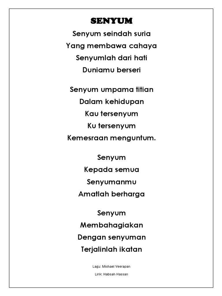 Lirik lagu senyum seindah suria. Senyum seindah suria yang membawa cahya senyumlah dari hati duniamu berseri. Senyum kepada semua senyumanmu amatlah berharga senyum membahagiakan dengan senyuman terjalinlah ikatan. Kepada semua senyumanmu amatlah berharga senyum. Senyum seindah suria yang membawa cahaya senyumlah dari hati duniamu berseri senyum umpama titian.