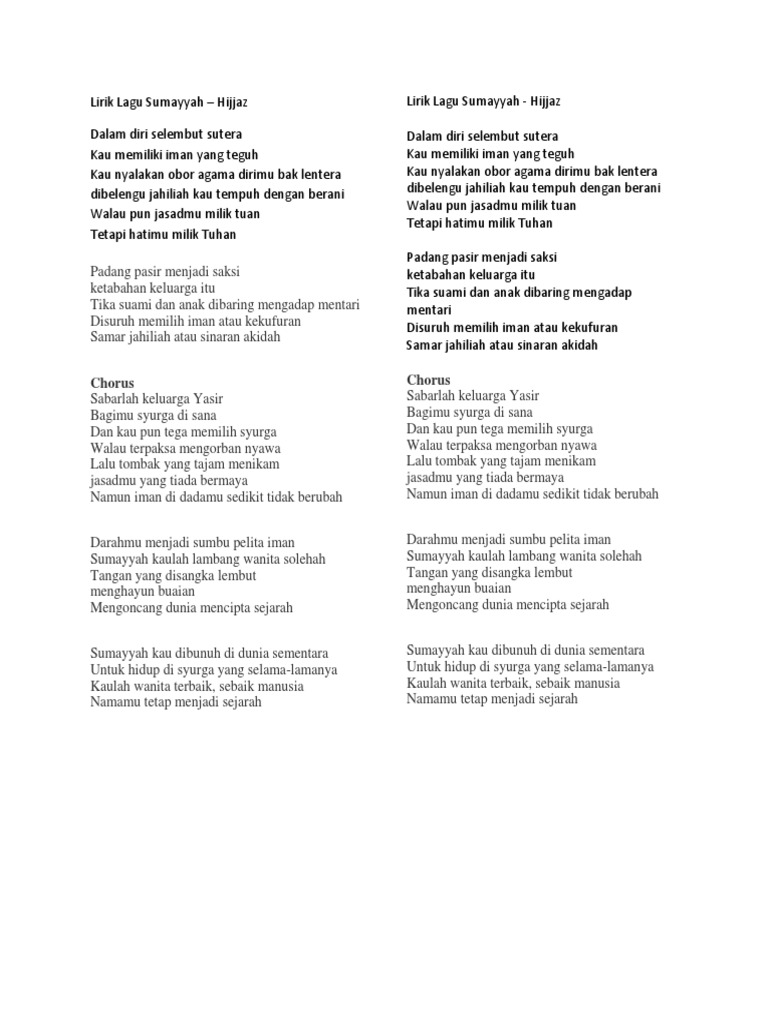 Instrumental lirik lagu sumayyah hijjaz instrument. Lirik lagu sumayyah hijjaz dalam diri selembut sutera kau memiliki iman yang teguh kau nyalakan obor agama dirimu bak lentera dibelengu jahiliah kau tempuh dengan berani walau pun jasadmu milik tuan tetapi hatimu milik tuhan padang pasir menjadi saksi ketabahan keluarga itu tika suami dan anak dibaring mengadap mentari disuruh memilih iman atau kekufuran. Lirik lagu sumayyah kumpulan hijjaz adalah seperti berikut. Dalam diri selembut sutera kau memiliki iman yang teguh.