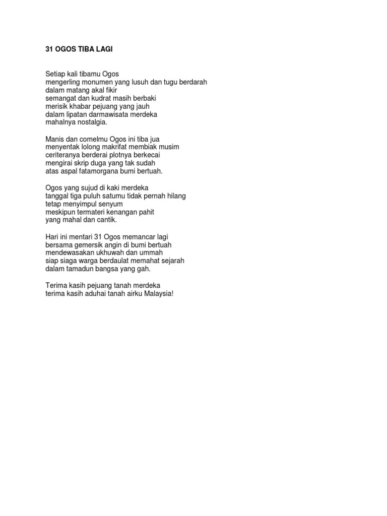 Lirik Lagu Melayu Tanggal 31 Ogos Sudirman Hj Arshad