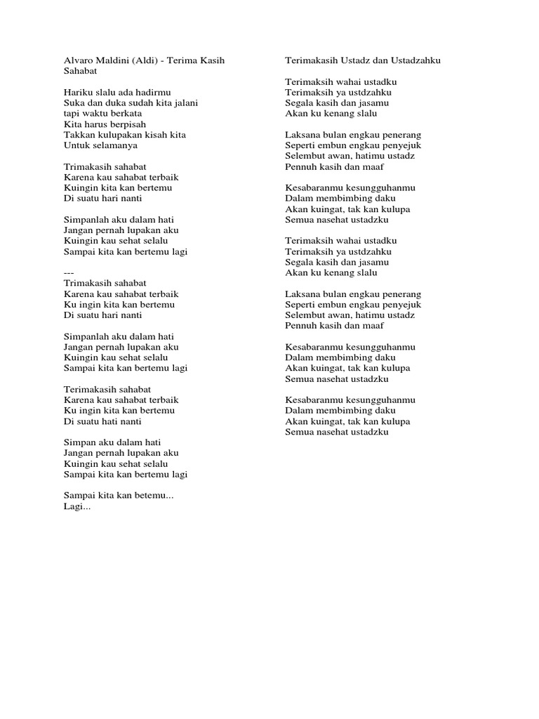 Lirik Lagu Terimakasih Sahabat Aldi Maldini Wattpad