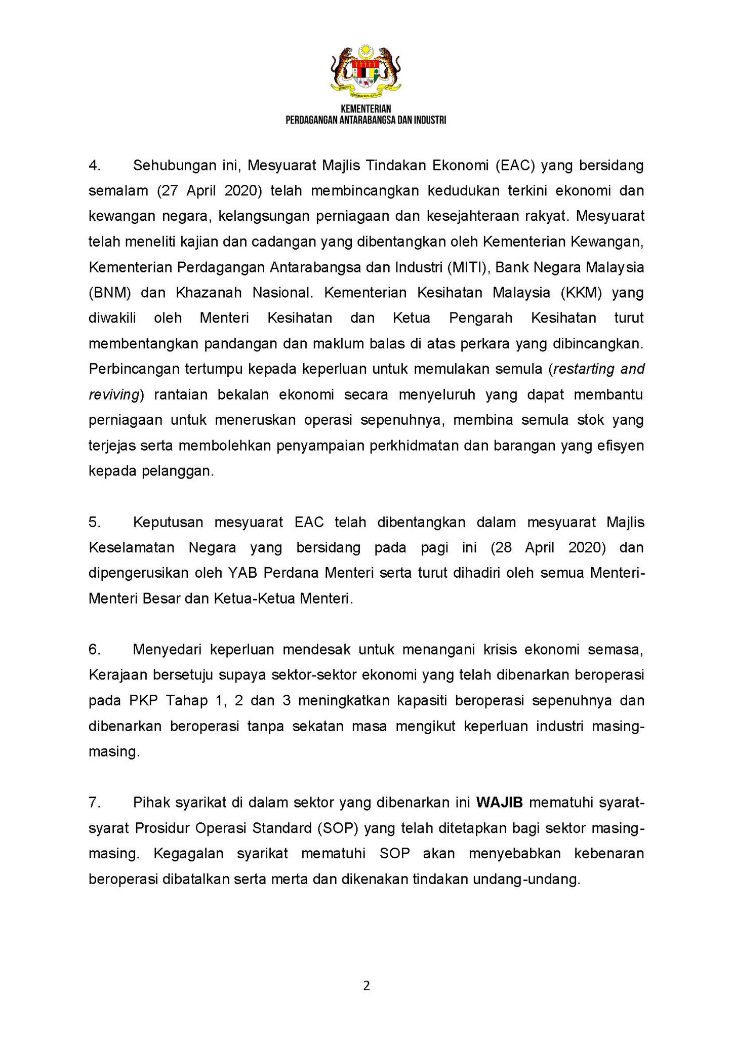 Mohamed Azmin Ali On Twitter Effective From Tomorrow 29 April 2020 Companies That Have Received Miti S Approval To Operate During The Mco Period Are Allowed To Increase Its Operating Capacity