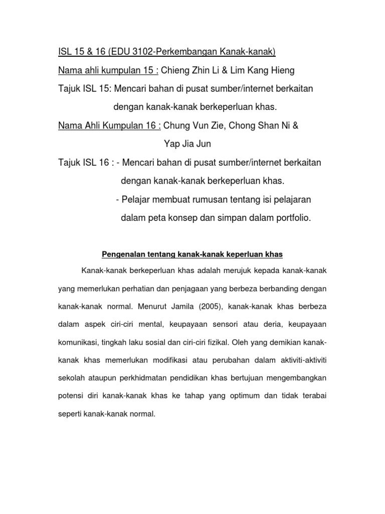 Persekitaran kanak kanak seperti kekurangan makanan berzat penyakit penyakit penderaan dan kurang kasih sayang juga merupakan faktor penting dalam perkembangan kanak kanak. Sila rujuk warta pendidikan khas atau kod amalan pendidikan khas. Kanak kanak berkeperluan khas sunday 15 november 2015. 2 7 1 lembam slow learner kanak kanak lembam dikenali sebagai kanak kanak yang memerlukan.